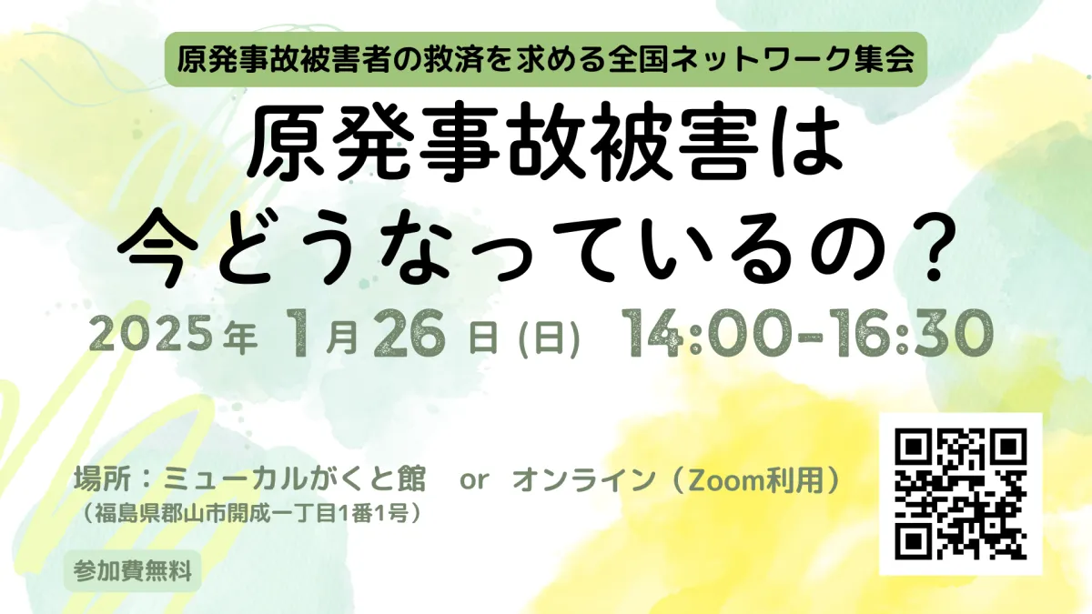 原発事故からの影響を受けた福島県内外の市民団体が連携して、「原発事故被害者の救済を求める全国ネットワーク」が1月26日(日)に福島県郡山市で「原発事故被害は今どうなっているの?」というテーマで集会を行います。この集会では、現在の原発事故による被害や廃炉の進捗を広く認識し、情報を共有することを目的としています。