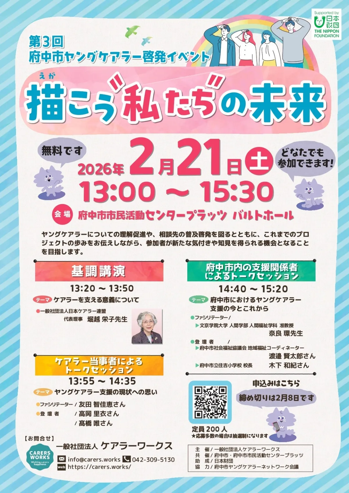 2026年2月21日(土曜日)に府中市では、家庭内で家族の介護をしている子供たち、いわゆる「ヤングケアラー」を支援するための啓発イベントが開催されます。このイベントの題目は「描こう“私たち”の未来」で、主催は一般社団法人ケアラーワークスです。イベントの目玉は、文京学院大学の奈良環准教授が登壇し、彼女の豊富な経験と知識を生かしたトークセッションが行われることです。