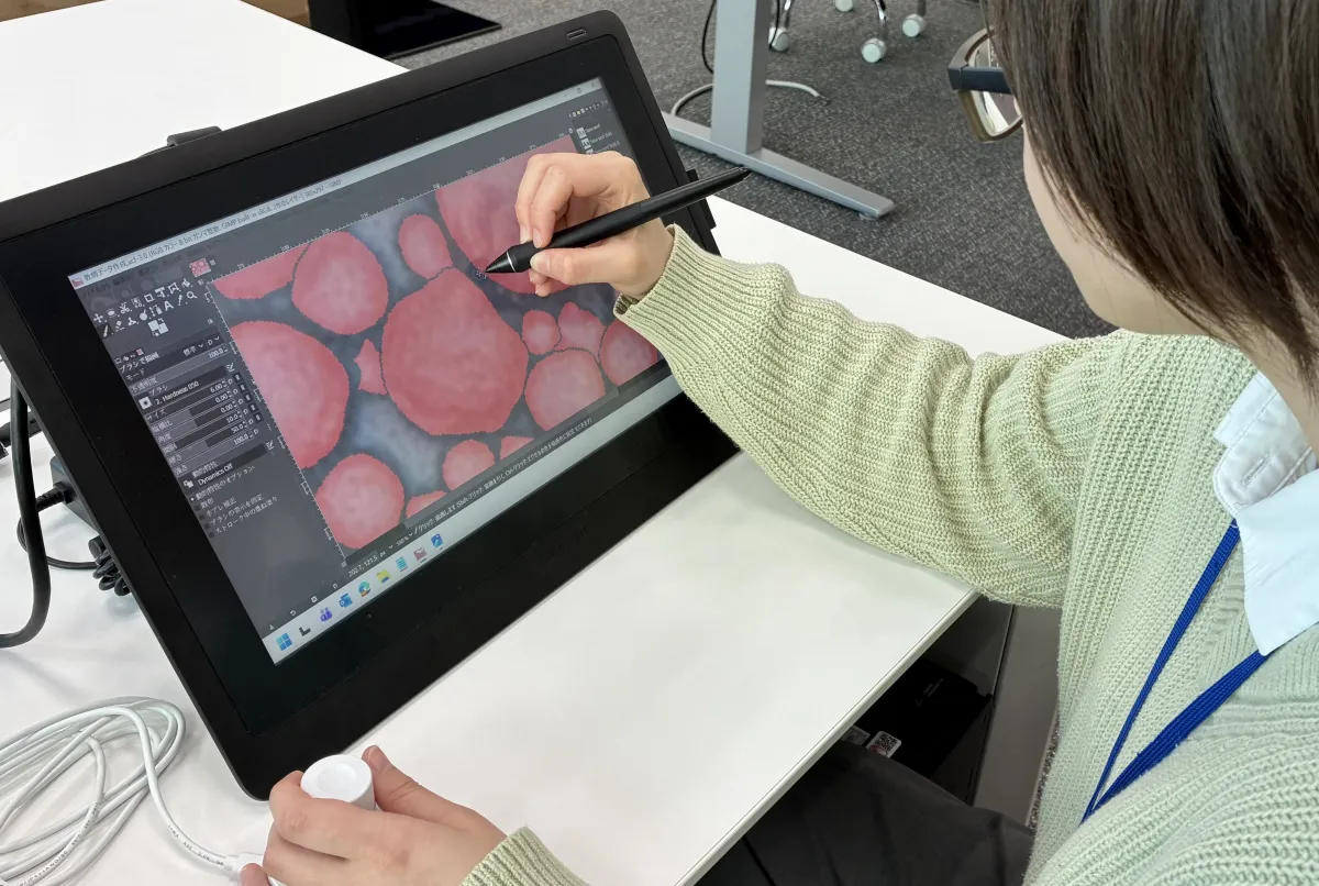 この教師データの作成には、画像中の粒子を一つずつ手作業で色分けする作業が含まれます。このプロセスには非常に高度な集中力と正確さが要求され、従来は人手不足が問題視されていました。しかし、計算情報科学研究センターとジョブ・サポートチームの共同作業により、効率よく、そして正確に教師データを作成することが可能となりました。