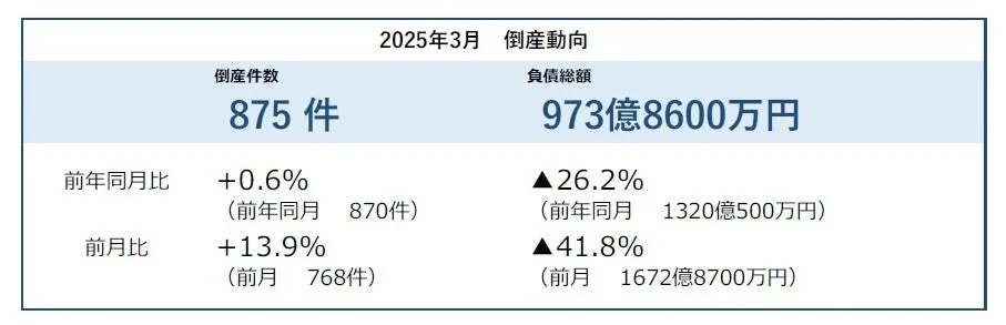 2025年3月の企業倒産件数が875件に達しました。この数値は、前年同月の870件をわずかに上回り、戦後最長である35カ月連続で前年を上回っています。現状を見たとき、特に注目されるのは、3月として3年連続で800件台の倒産が続いていることです。だが、その背景にはどのような要因が存在するのでしょうか。