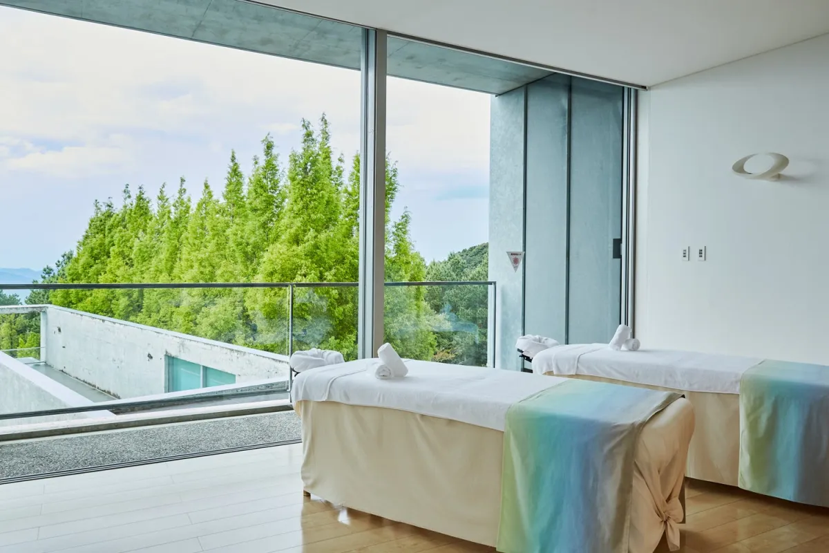 スパ体験のほかに、愛媛の季節の素材を生かした料理長・本城英也による懐石料理も魅力的です。この料理は、地域の環境や歴史、素材の持つ力を感じられるもの。さらに、この特別なホテルは、かつての美術館だった建物を改装しており、安藤忠雄氏の建築の中に点在するアート作品や美意識あふれる環境が、心身を整えた後に感性を富ませてくれます。