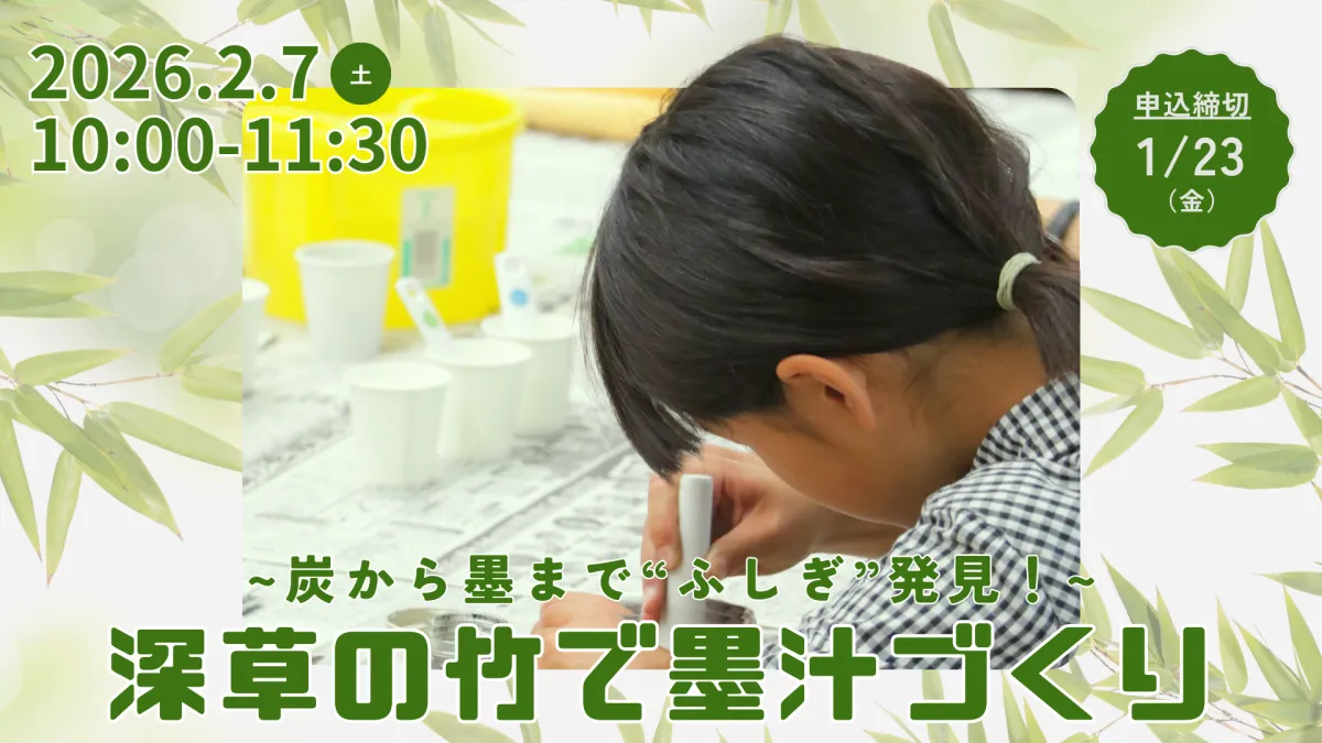 今回のイベントは「~炭から墨まで“ふしぎ”発見!~深草の竹で墨汁づくり」と名付けられ、竹炭を利用して墨汁を作る体験を通じて、自然素材の力を感じながら地球環境について考える流れです。