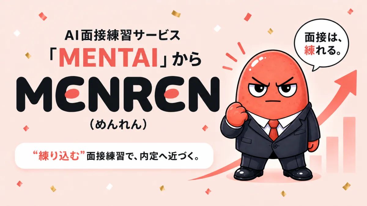 株式会社X-HACKが展開するAI面接練習サービスが、名称を「MENTAI」から「MENREN」に変更しました。「面」(接)を「練」(り込む)という意味を込めたこの新しい名前は、従来の単発で終わるツールから、繰り返し練習することでスキルを向上させるサービスへと進化を遂げることを目指しています。