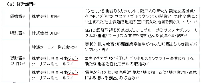 - - 経営部門では、持続可能な観光に向けた戦略や地域住民との協働に関する実践が評価されました。