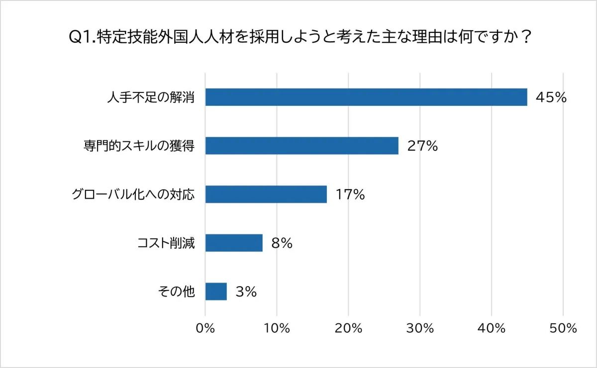 特定技能外国人材の採用を行う株式会社ONODERA USER RUN(OUR)は、300名の企業関係者を対象にしたアンケートを実施しました。その結果、採用理由の第一位が「人手不足の解消」で45%を占め、第二位は「専門的スキルの獲得」で27%でした。これらのデータは、企業が直面する課題を解決するため、特定技能外国人材の採用を選択していることを示しており、特に「外食業」や「宿泊業」といった分野においては、インバウンド需要への対応も希求されています。