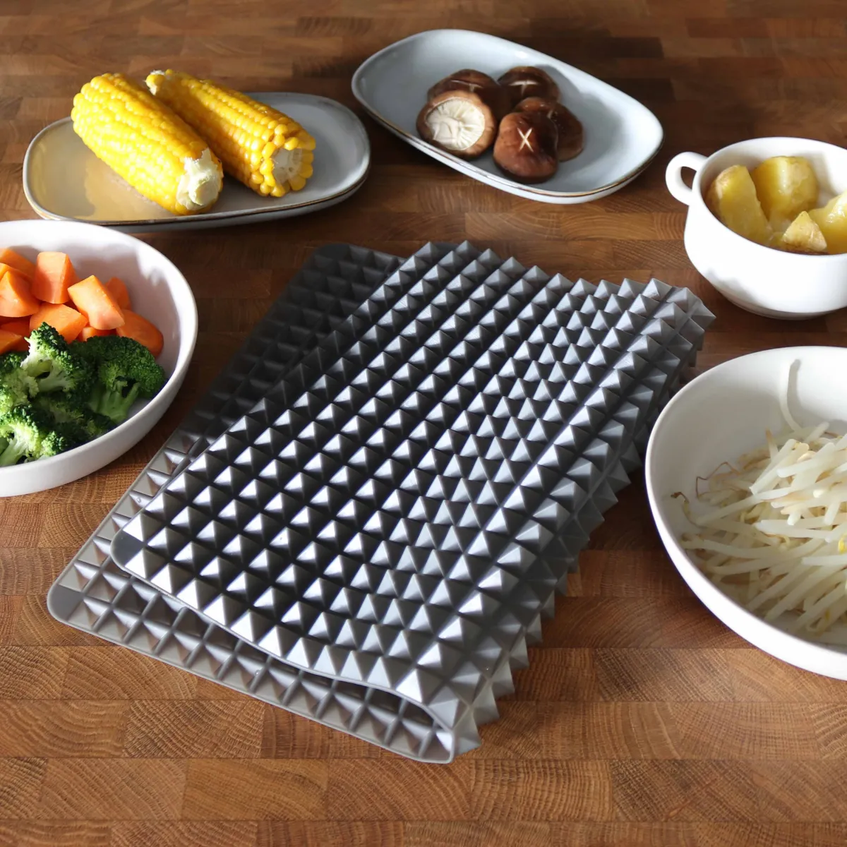 山向きや谷向きを使い分けることにより、さまざまな料理に対応できるのもこのクッキングマットの特徴です。焼く、蒸す、煮るといった調理法に合わせて使うことができ、料理の幅が広がります。