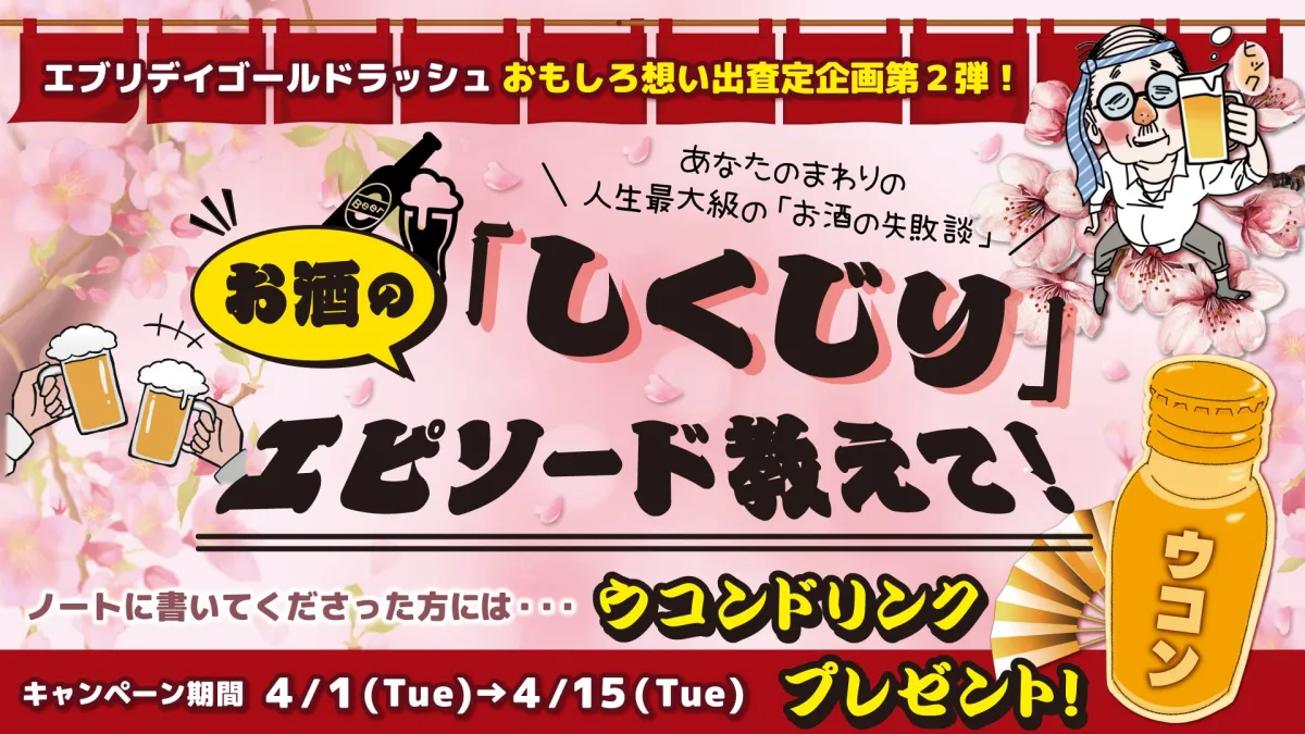 春の歓送迎会やお花見の季節が近づくと、人々はお酒を楽しむ機会が増えます。しかし、楽しい思い出には時に失敗が伴うことも。「エブリデイゴールドラッシュ」が展開するおもしろ想い出査定では、そんなお酒にまつわる失敗談を集め、ウコンドリンクプレゼントの企画を実施しています。
