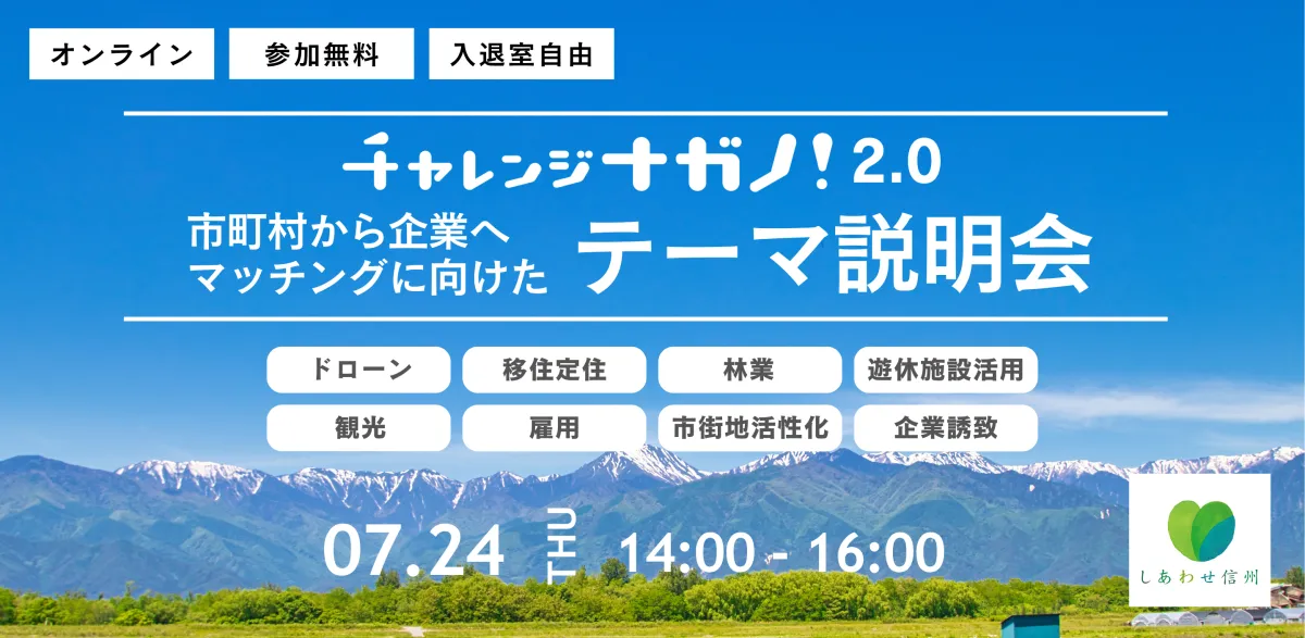 長野県が主催する「チャレンジナガノ2.0」は、地域の課題を解決する企業とのマッチングを推進する独自の取り組みです。この取組は、県内外の企業に対して地域の活性化を共に目指すパートナーを募集するものです。