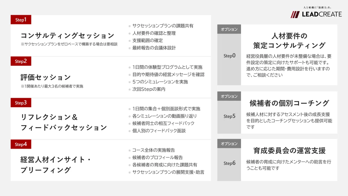 『Authenticプログラム』は、次世代の経営者選びに理論と実践を融合させた新しい試みです。企業が持続的に成長を促進するために、質の高い後継者を見極める手助けを行います。リードクリエイトの豊富な実績と専門的知見に基づき、企業は次世代の経営者選びの精度を高めることが期待されます。今後の説明会や体験コースの参加を通じて、自社に最も適した施策を見極める機会をぜひご活用ください。