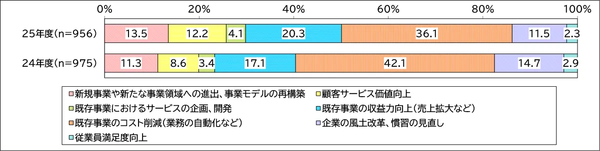 本年度の調査では、デジタルトランスフォーメーション(DX)の目的が「守り」から「攻め」に移行していることがわかります。昨年度に比べ、「既存事業のコスト削減」という目的は減少し、逆に「既存事業の収益力向上」や「新規事業への進出」が重要視されるようになっています。これは、企業が業務効率化だけでなく、新たな収益を生み出すことを重視し始めていることを示唆しています。