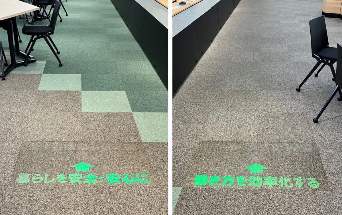 フロアマットに1~2メートル近づいたときに文字や絵柄が現れ、そのサプライズ感は訪れる人々に新しい感覚を届けます。意図しない人まで全体に視認可能ではなく、近い人だけがその魅力を体感できます。