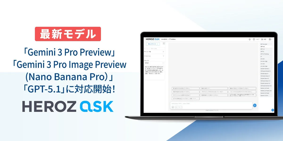 HEROZ株式会社が提供する法人向け生成AI SaaS「HEROZ ASK」が、急速に進化するAI技術に対応し、新たにGoogle社の最新AIモデル「Gemini 3 Pro Preview」「Gemini 3 Pro Image Preview (Nano Banana Pro)」を使用可能にします。これに加え、OpenAI社の「GPT-5.1」も対応済みで、順次利用が開始されます。