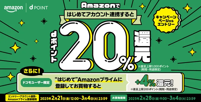 このキャンペーンは、まずエントリーを行ってからが対象となります。エントリー期間は2025年2月21日(金)から3月4日(火)まで、この期間に「dアカウント」と「Amazonアカウント」の連携が必要です。連携後、キャンペーン期間中に「Amazon.co.jp」での買い物が対象となり、買い物金額の20%に相当するdポイント(期間・用途限定)が還元されます。