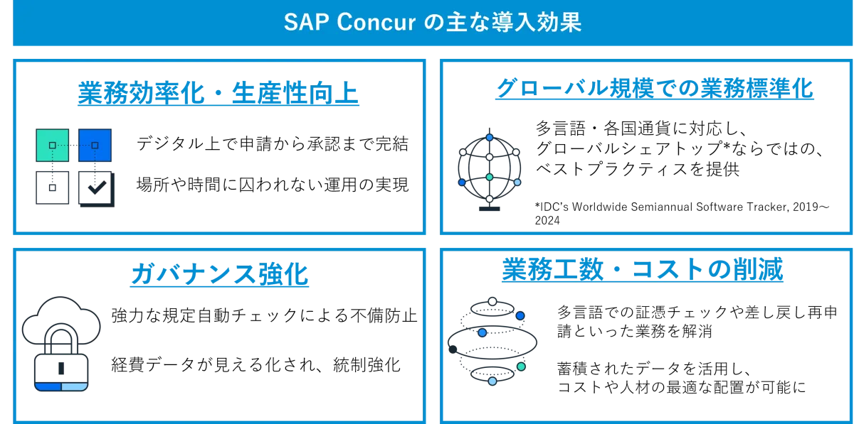 SAP Concurの導入によって、経費管理が高度化し、業務の効率化が実現されることが見込まれています。さらに、コストや人材の最適化が行われることで、米国拠点では年間最大1700万円のコスト削減が期待されています。この新しいシステムでは、経費精算、請求書管理、業務の承認プロセスを一元化し、さらなる効率化を図ります。