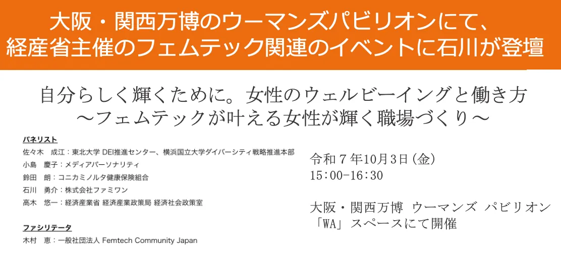 2025年10月3日、大阪・関西万博のウーマンズパビリオン「WA」スペースで、ファミワンの代表取締役である石川勇介氏が登壇するフェムテック関連のイベントが開催される。このイベントのテーマは『自分らしく輝くために。女性のウェルビーイングと働き方~フェムテックが叶える女性が輝く職場づくり~』だ。出展者には、東北大学や横浜国立大学の専門家、メディアパーソナリティ、コニカミノルタの健康保険組合の担当者など多彩な顔ぶれが揃い、熱い議論が交わされることが期待されている。