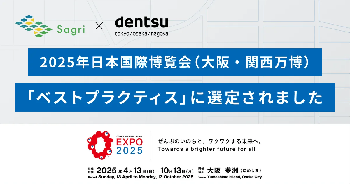 サグリ株式会社が、株式会社電通と共創した『圃場データ・テロワール・ブランディング・プロジェクト』が2025年日本国際博覧会、通称大阪・関西万博の「ベストプラクティス」に選定されました。これは世界の重要な問題解決に寄与するプロジェクトを評価するプログラムです。