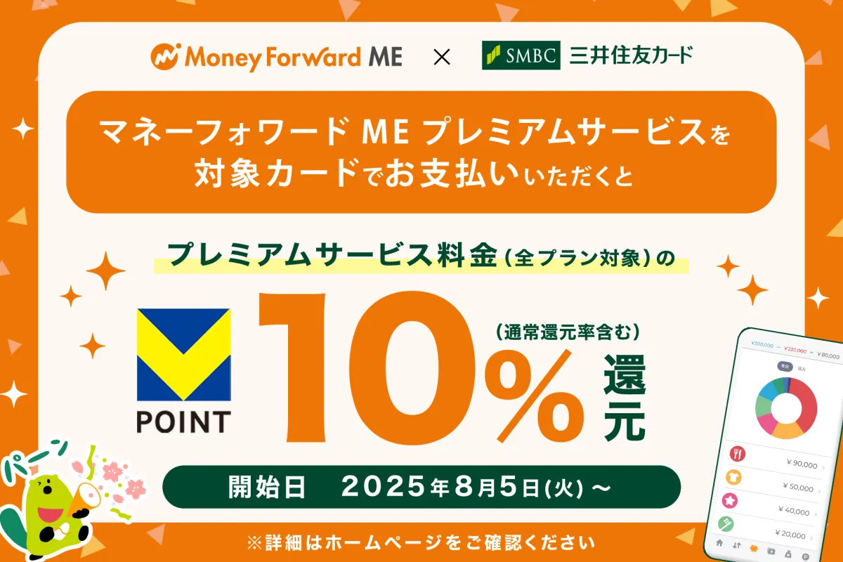 2025年8月5日、マネーフォワードホーム社の提供する『マネーフォワード ME』のプレミアムサービスにおいて、三井住友カードでの支払いに対しVポイント10%の還元が開始されます。このサービスはマネーフォワード MEのスタンダードコースと資産形成アドバンスコースが対象となり、通常のポイント分も含めた還元率が設定されています。