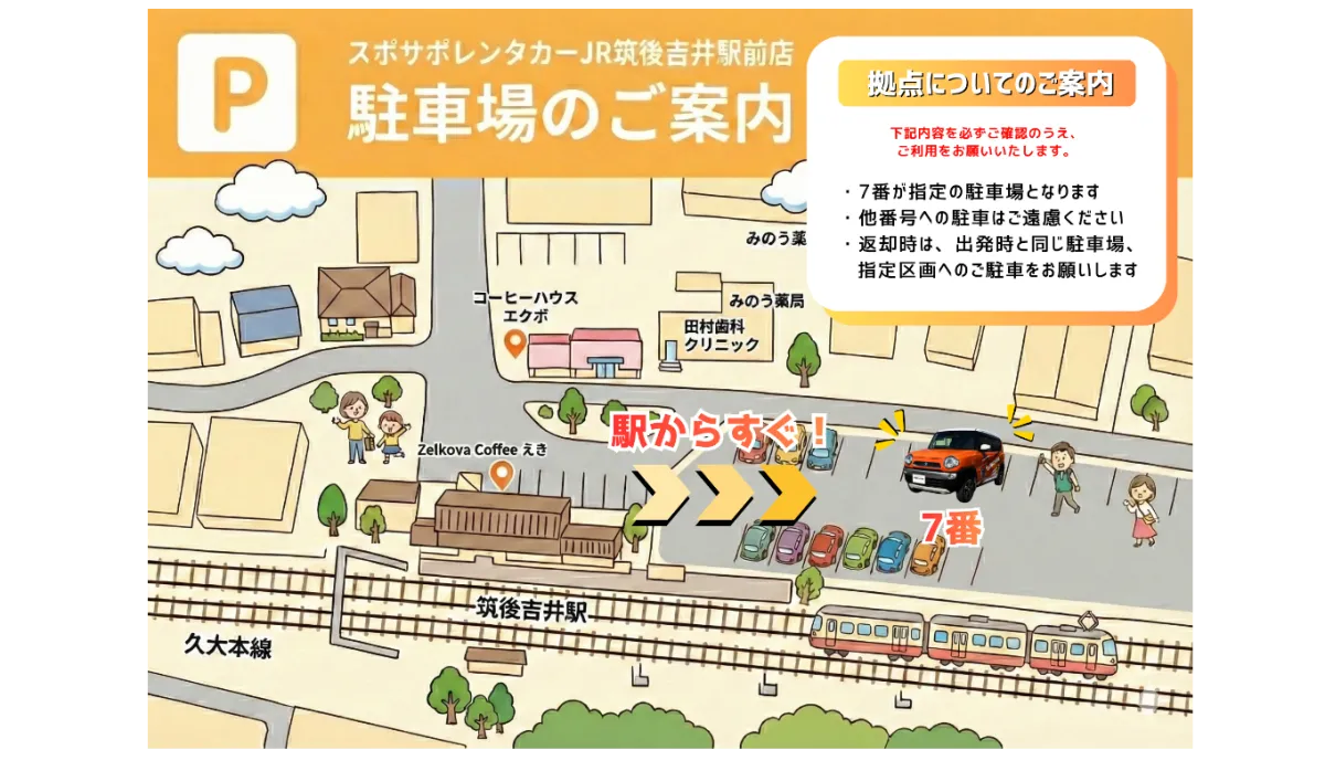 利用手順としては、まず公式LINEを友達追加し、特設サイトから申し込みを行います。その後、公式LINEから利用方法の案内が届き、車両の写真が前日または当日に送られてきます。借用する車は「JR筑後吉井駅」から徒歩1分の駐車場7番で受け取ることができます。