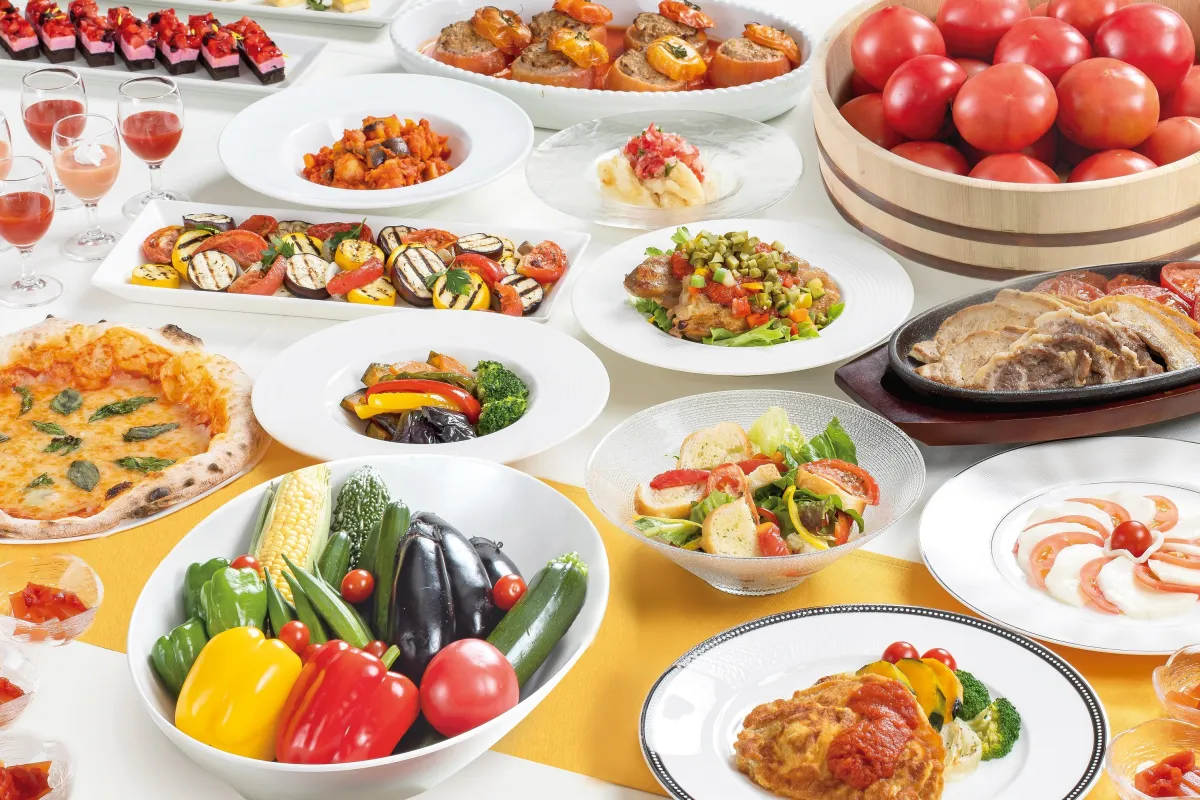 「ナガノトマトコラボレーション ランチバイキング&ウイークナイト・ディナーブッフェ」が楽しめます。新鮮なトマトを使用した多彩な料理が揃い、食べ放題の形式で提供されます。