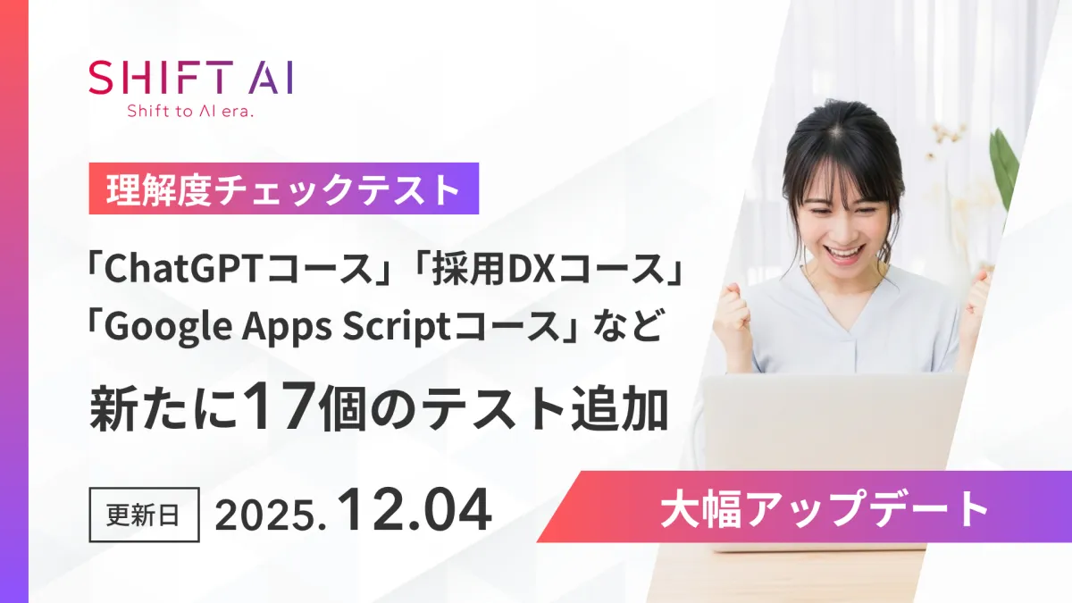 株式会社SHIFT AIは2025年8月より提供を開始している法人向けリスキリングサービス「SHIFT AI for Biz」のオンライン学習プラットフォームにて、理解度チェックテスト機能を大幅に更新しました。この新機能は、受講後の理解度を効果的に測定し、より良い学習体験を提供することを目的としています。特に、今回のアップデートでは新たに17コースが追加され、幅広い学習ニーズに応えられるようになっています。