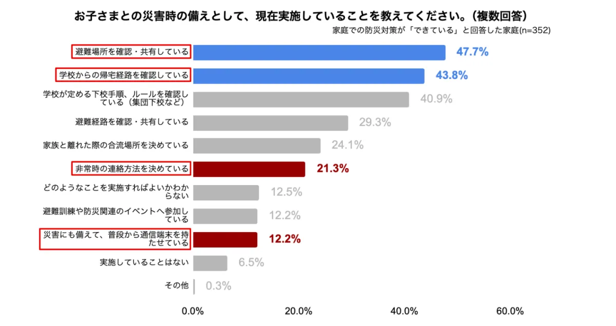 調査によれば、家庭の約70%が「家族の合流場所の確認」や「避難経路の共有」ができていないと回答しています。また、子どもとの「連絡手段」を準備できている家庭はわずか21.3%、つまりほとんどの家庭が重要な情報を整備していないことがわかりました。