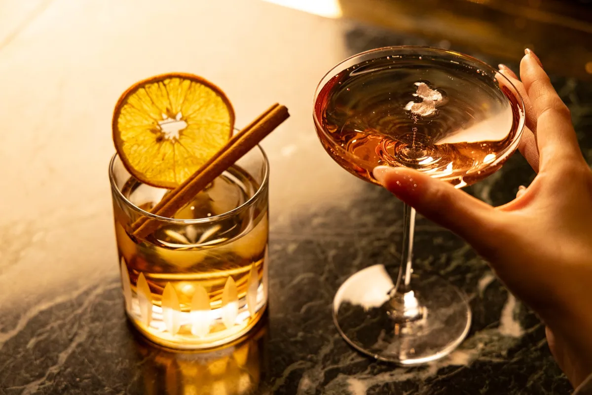 ノンアルコールのウィスキーとネマ・アブサンを用いたこのカクテル。スフィアアイスを使い、ドライオレンジやシナモンスティックをスモークすることで、深みのある味わいと独自のキックを実現しています。ムーディーなジャズが流れる中、映画のワンシーンのようなひとときを楽しむことができます。