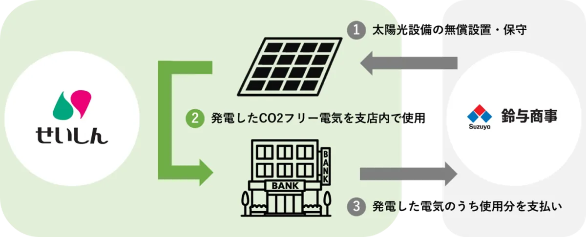 静清信用金庫(以下、静清信金)は、駒形支店のリニューアルにあたり、新たな環境配慮の取り組みとして、鈴与商事株式会社が提供するオンサイトPPAサービスを導入します。このサービスは、太陽光発電設備を店舗敷地内に設置し、自家消費可能な電力を供給する構造です。