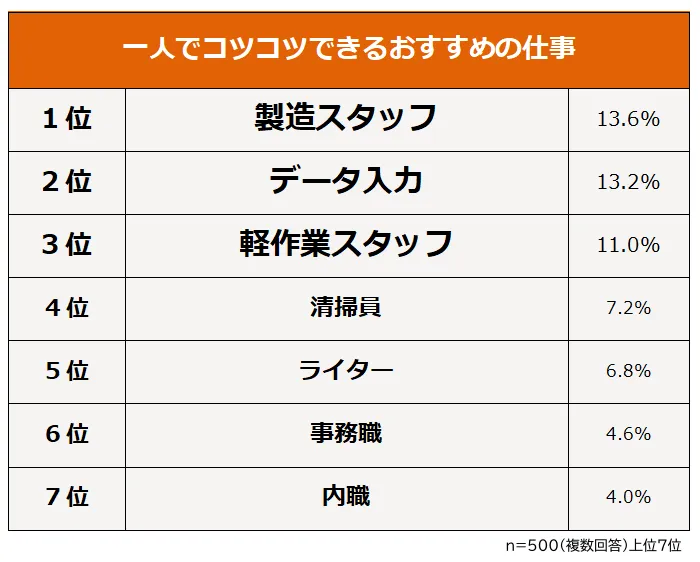 一人でコツコツできる仕事が好きな500人を対象にアンケート調査を実施し、その結果をまとめてランキング形式で発表しました。この調査は、外部の人とのコミュニケーションに疲れ、自分のペースで働くことを重視する傾向が強まっている中で、人々がどういった仕事に魅力を感じているのかを探るものです。