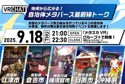 近年、多くの自治体がメタバースによる地域振興に取り組んでいます。特に神奈川県横須賀市、島根県江津市、鳥取県倉吉市、鹿児島県日置市の四つの自治体は、今後の可能性を探るための特別イベント「地域から広がる!自治体メタバース最前線トーク」を開催します。このイベントは、自治体がどのようにメタバースに関わり、その取り組みにどのような課題や工夫があったのかについて、実際の当事者が語る貴重な機会です。