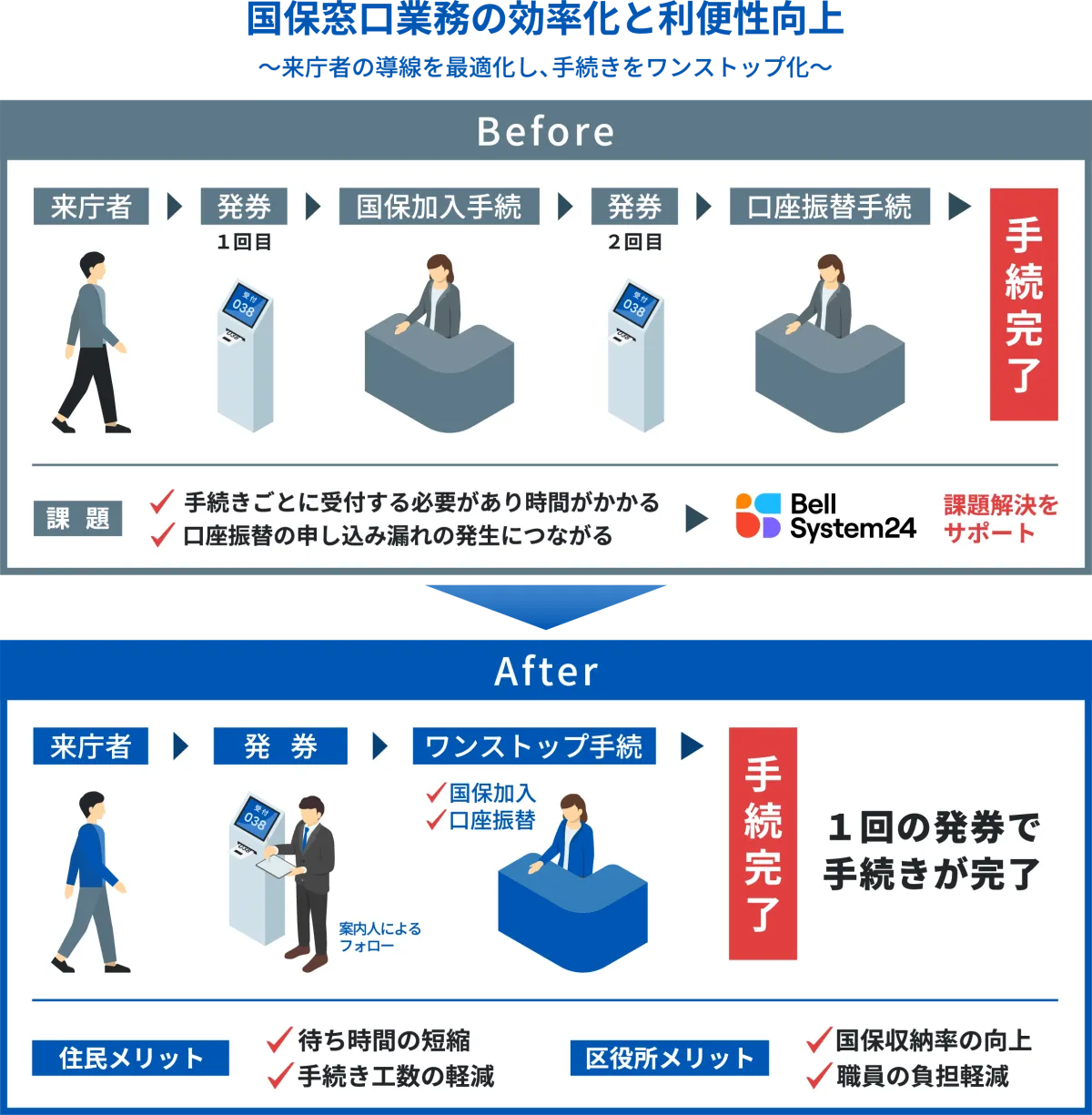 ベルシステム24は、このような課題解決に向けて新たなアプローチを取り入れました。国民健康保険加入から口座振替申請までの業務フローを一元化し、各所の連携を強化しました。また、新庁舎への移転に際しては、リハーサルを重ねて住民誘導の施策を実行しました。これにより、窓口での待ち時間の短縮や手続きの効率化が実現しました。