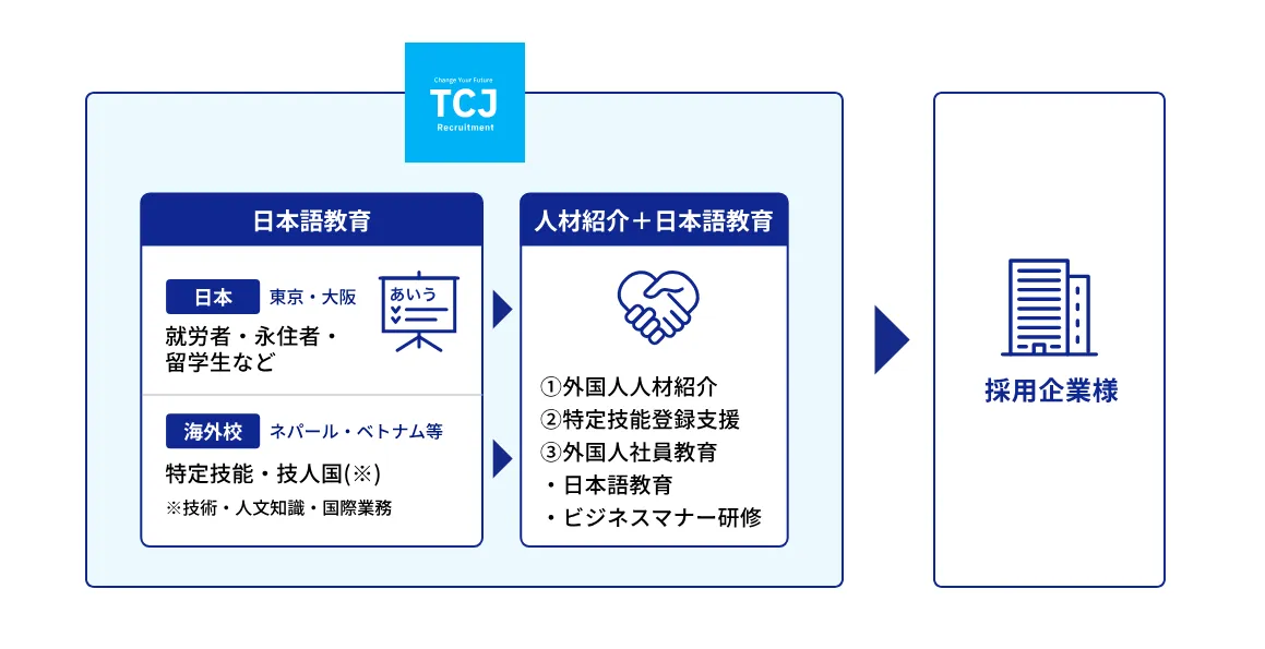 TCJグローバルは、37年間の日本語教育の実績を活かし、80ヶ国以上の人材を育成してきたノウハウを駆使して、これらの課題を解決するためのサービス「TCJリクルートメント」を展開しています。このサービスでは、企業が求める直結した解決策を提供し、特に人事・労務や経営企画に携わる方々へ具体的なナビゲーションを行います。