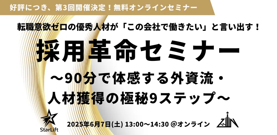 セミナーのモデレーターには株式会社ZENの伊藤代表が、講師としてStarLift株式会社の原代表が登壇します。原代表は、彼自身の豊富な経験と実績を基に、外資系企業での成功体験をもとにした「人材獲得の極秘9ステップ」という具体的な方法を解説します。このアプローチは、採用をマーケティングと捉える観点から行われ、優秀な人材に対して「この会社で働きたい」と思わせることを目的としています。