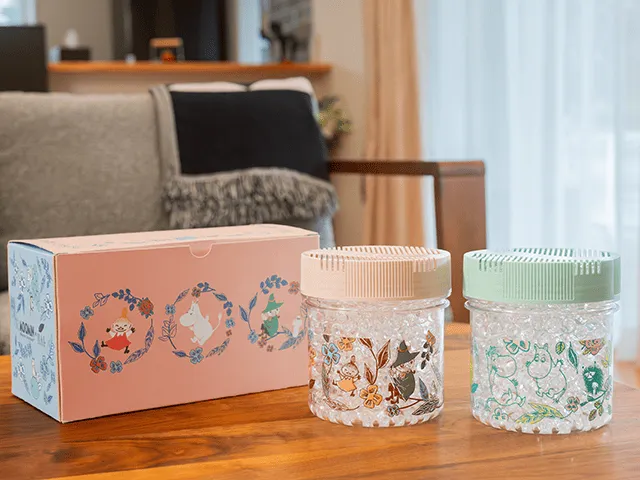 このビーズを置くだけで、リビングや玄関、寝室などの空間をやさしくケアします。無臭タイプなので空間の雰囲気を損なわず、インテリアとしても楽しめます。色合いはベージュとグリーンで、ムーミンやその仲間たちが描かれています。