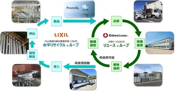 大和リースとLIXILは、リース用アルミサッシの水平リサイクルシステムを構築しました。このスキームでは、まず大和リースがシステム建築事業で使用したアルミサッシを回収し、再生に向けたプロセスに移ります。LIXILの独自技術により、これらのサッシは「PremiAL」シリーズという環境配慮型低炭素アルミに生まれ変わります。このプロセスを通じて、年間で約272トンのCO₂を削減できる見込みです。