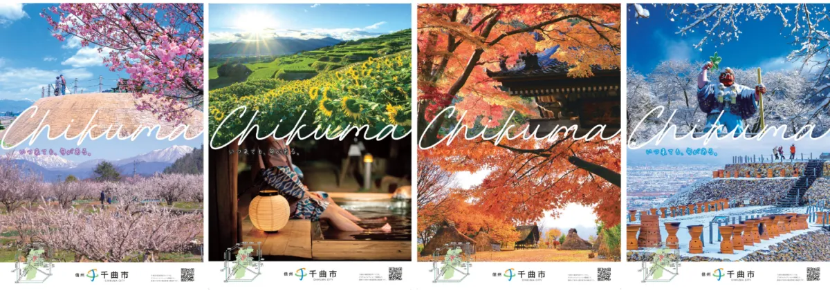 新たに開設された観光特設サイトにあわせて、千曲市の四季をテーマにした観光ポスターとPRチラシも作成されました。これらは各季節ごとに異なる景観を持つ4種類のポスターと、千曲市の魅力あふれる写真を集めたデザインのチラシに仕上がっています。ポスターやチラシには二次元コードが含まれており、これをスキャンすることで簡単に観光情報にアクセスできます。