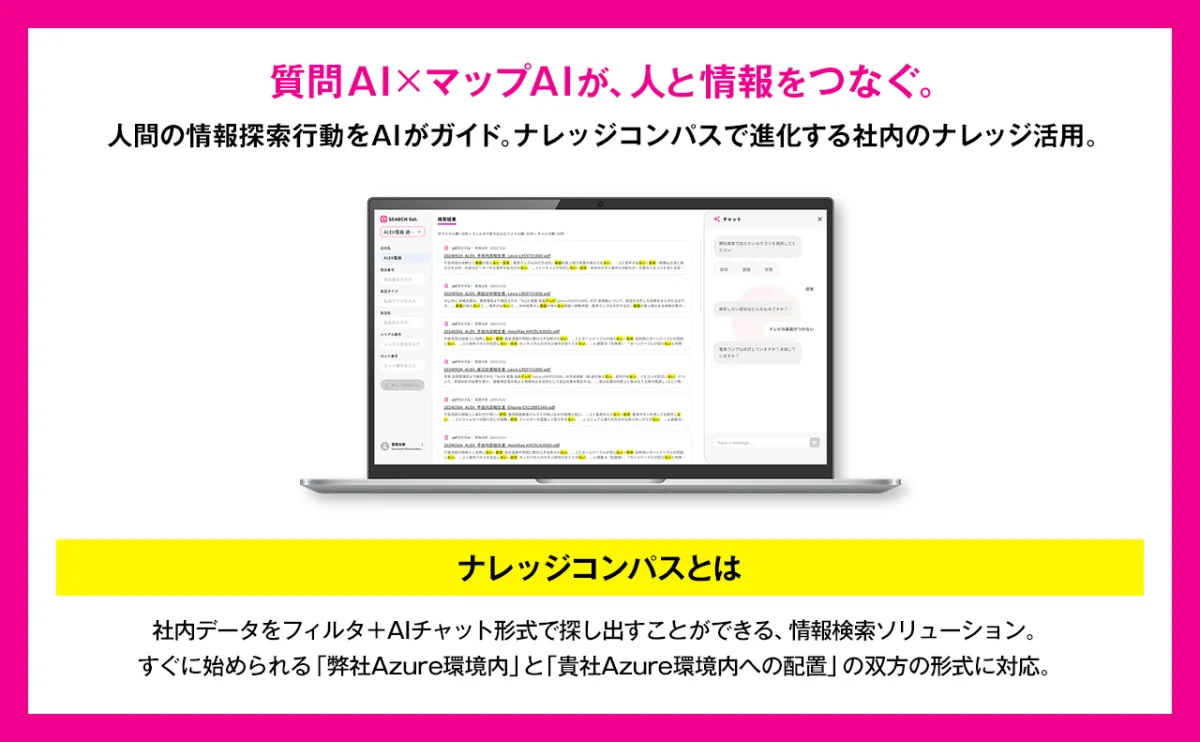 「ナレッジコンパス」は、専用のAzure環境内での提供と企業の独自Azure環境への設置、どちらにも対応可能です。運用ポリシーやセキュリティ要件に応じた最適な選択肢を提供します。