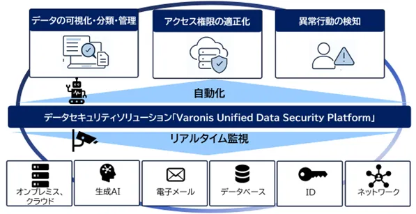 「Varonis Unified Data Security Platform」は、企業が所有するデータに対し、機密性に基づくラベルを自動で付与する機能を持っています。これにより、未整備または旧式の機密情報ファイルの適切な管理が可能となり、データアクセスに関するポリシー違反を検出し、自動で修正が行われます。また、生成AIの利用に伴う情報漏洩リスクを抑制するため、プロンプトに不適切な語を含むかどうかを検知したり、生成AIがアクセスできるデータを制約する安全な運用を実現します。