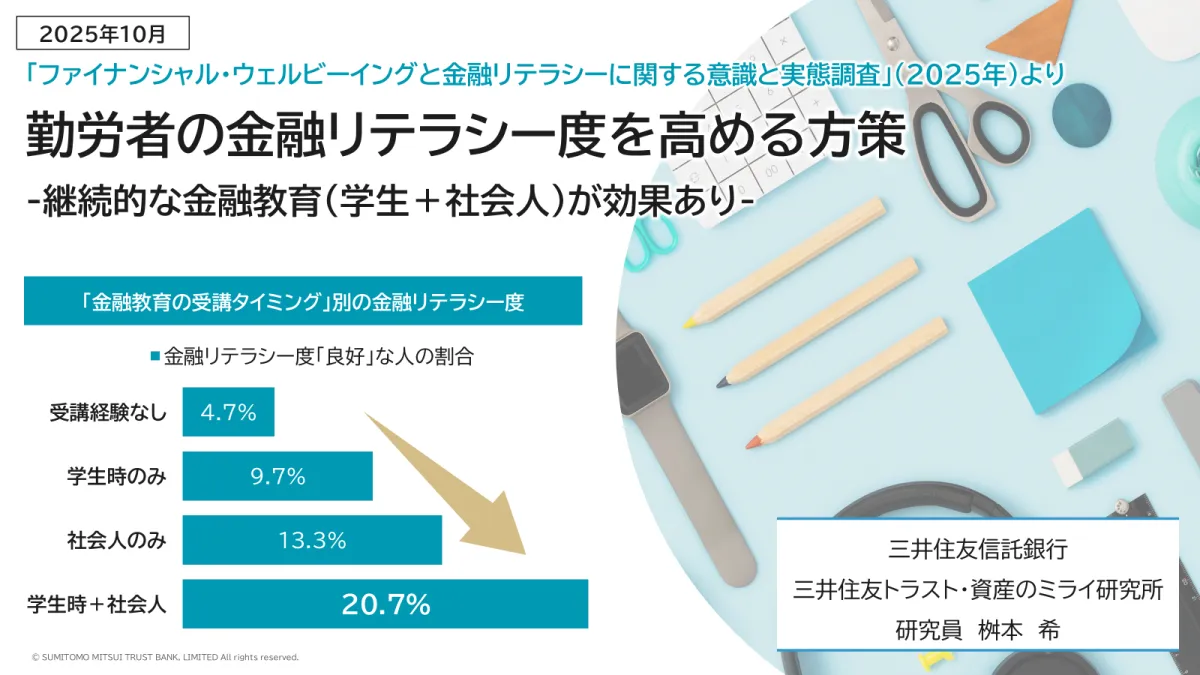 近年、日本では「貯蓄から資産形成へ」の流れが強まっており、金融リテラシーの向上が重要視されています。三井住友トラスト・資産のミライ研究所(以下「ミライ研」)が2025年に実施した調査では、18歳から69歳までの勤労者1万人を対象に、金融リテラシー度と資産形成への取り組みに関する詳細なデータを収集しました。