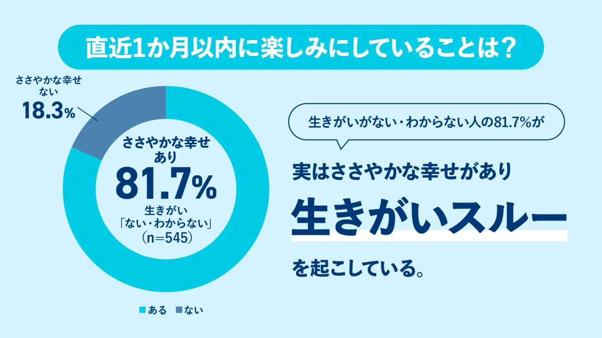 日本社会が人生100年時代を迎え、価値観が多様化する中、ソニー生命は人々が心から満ち足りた生活を送れるよう手助けする必然性を感じています。事前に実施した「生きがい実態調査」では、驚くことに回答者のうち81.7%が「生きがいがない」と感じている一方で、実は「ささやかな幸せ」を日常生活の中で実感していることがわかりました。