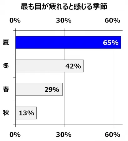 調査によると、「最も目が疲れる季節」として「夏」が65%と最も多く、冬の42%を大きく上回りました。