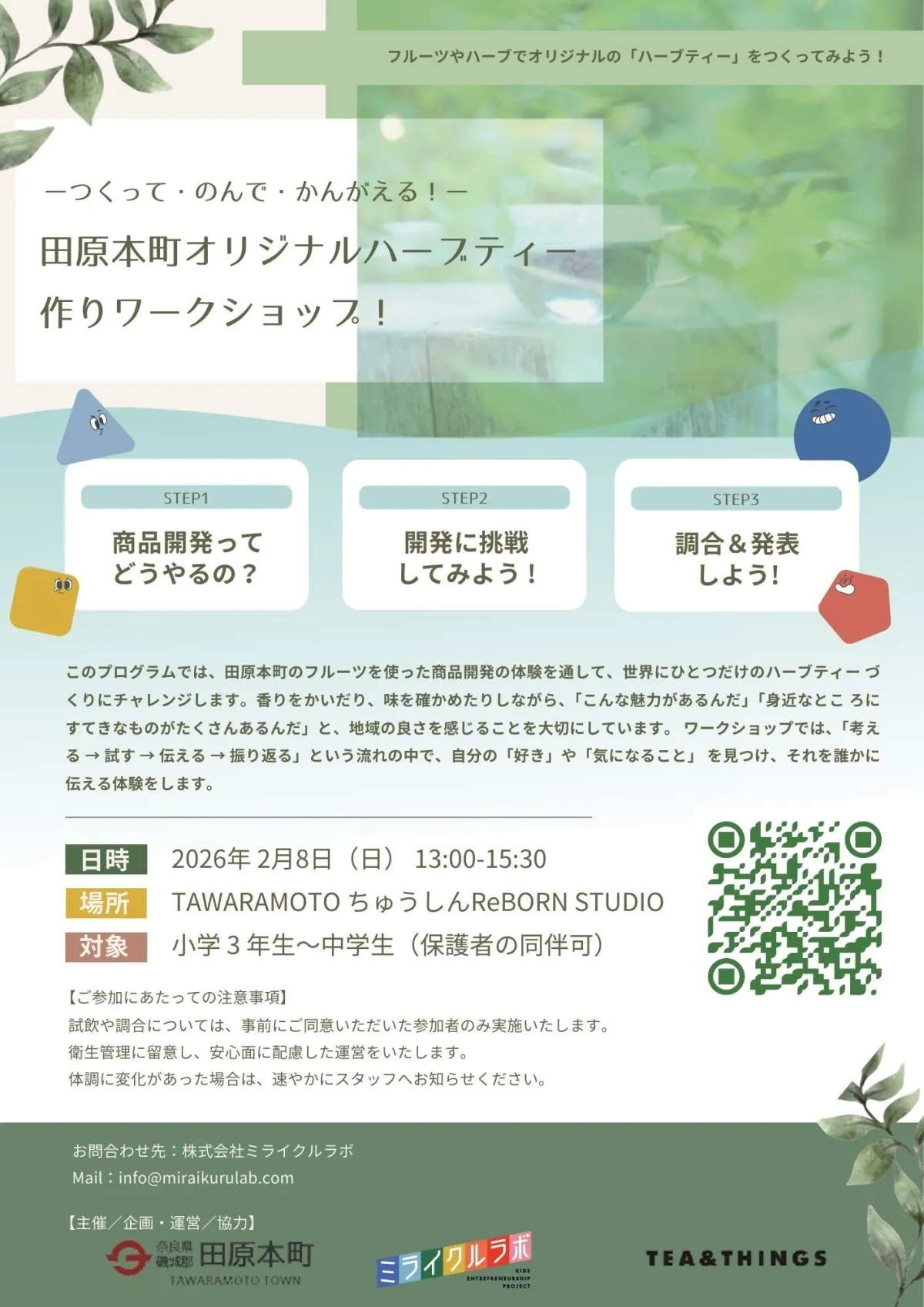 2026年2月8日、奈良県の田原本町で、株式会社ミライクルラボが主催する「田原本町オリジナルハーブティーづくりワークショップ」が開催されます。このイベントは、地域の資源を活用した体験型プログラムであり、小学3年生から中学生を対象にしています。保護者も一緒に参加可能で、親子で楽しむことができる企画です。