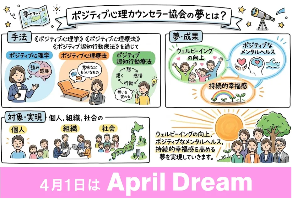 当協会は、「April Dream」というプロジェクトにも賛同しています。この活動では、4月1日に企業や団体が夢を発信し、それを現実化することを目指します。私たちの夢は、ポジティブ心理学やポジティブ認知行動療法を通じて、前向きなメンタルヘルスを促進し、持続的な幸福感を高めることです。この思いを実行に移すことが、私たちの使命といえます。