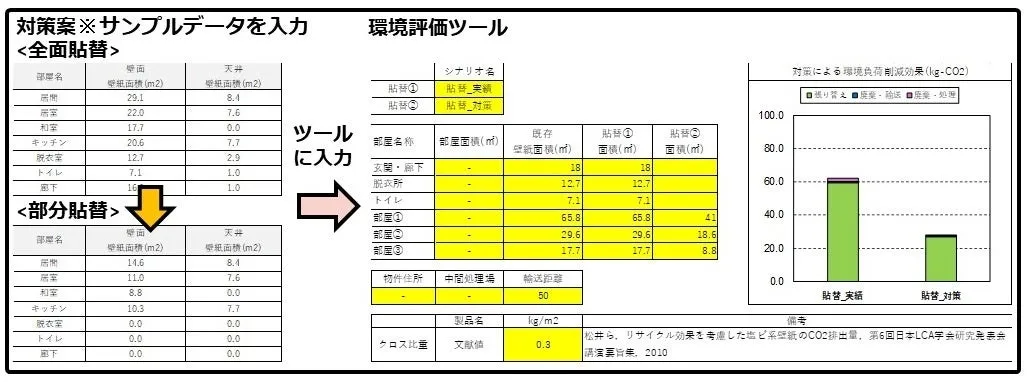 株式会社市萬との連携により、本評価ツールが開発されました。このツールを利用することで、2024年12月から2025年1月にかけて実際の工事現場を調査し、張り替えの環境影響を評価することが可能となります。また、将来的には壁紙以外の更新資材についても評価ツールを拡張し、賃貸住宅全体の環境負荷を軽減する計画が進められています。