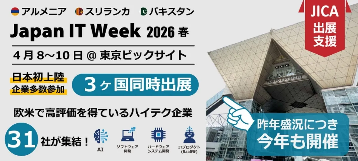 2026年4月8日から10日まで、東京ビッグサイトにおいて「Japan IT Week 2026春」が開催されます。この大規模なIT展示会には、アルメニア、スリランカ、パキスタンからの計31社のグローバルテック企業が出展します。これらの企業は、欧米を中心に高く評価されているものの、日本ではあまり知られていないため、言語や商習慣の違いがビジネスマッチングを難しくしています。独立行政法人国際協力機構(JICA)は、これらの国々のICT産業を支援し、日本企業との協業機会を提供するために今回の展示会への出展を支援しています。