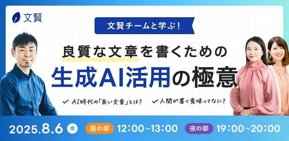 株式会社ウェブライダーが8月6日(水)に開催する無料オンラインセミナー「文賢チームと学ぶ!良質な文章を書くための生成AI活用の極意」は、文章作成に携わる皆さんに向けた内容が盛りだくさんです。
