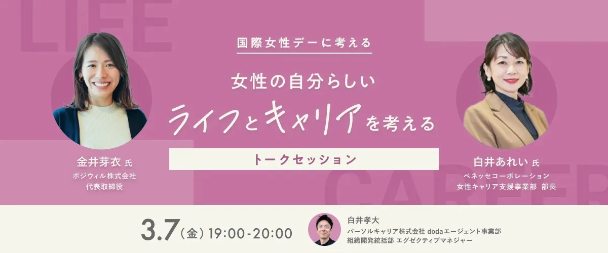 2025年3月7日、国際女性デーに際し、転職サービス「doda」を運営するパーソルキャリア株式会社が「女性の自分らしいライフとキャリアを考える」というテーマのオンラインイベントを実施します。参加は無料で、女性のビジネスパーソンに向けた内容です。