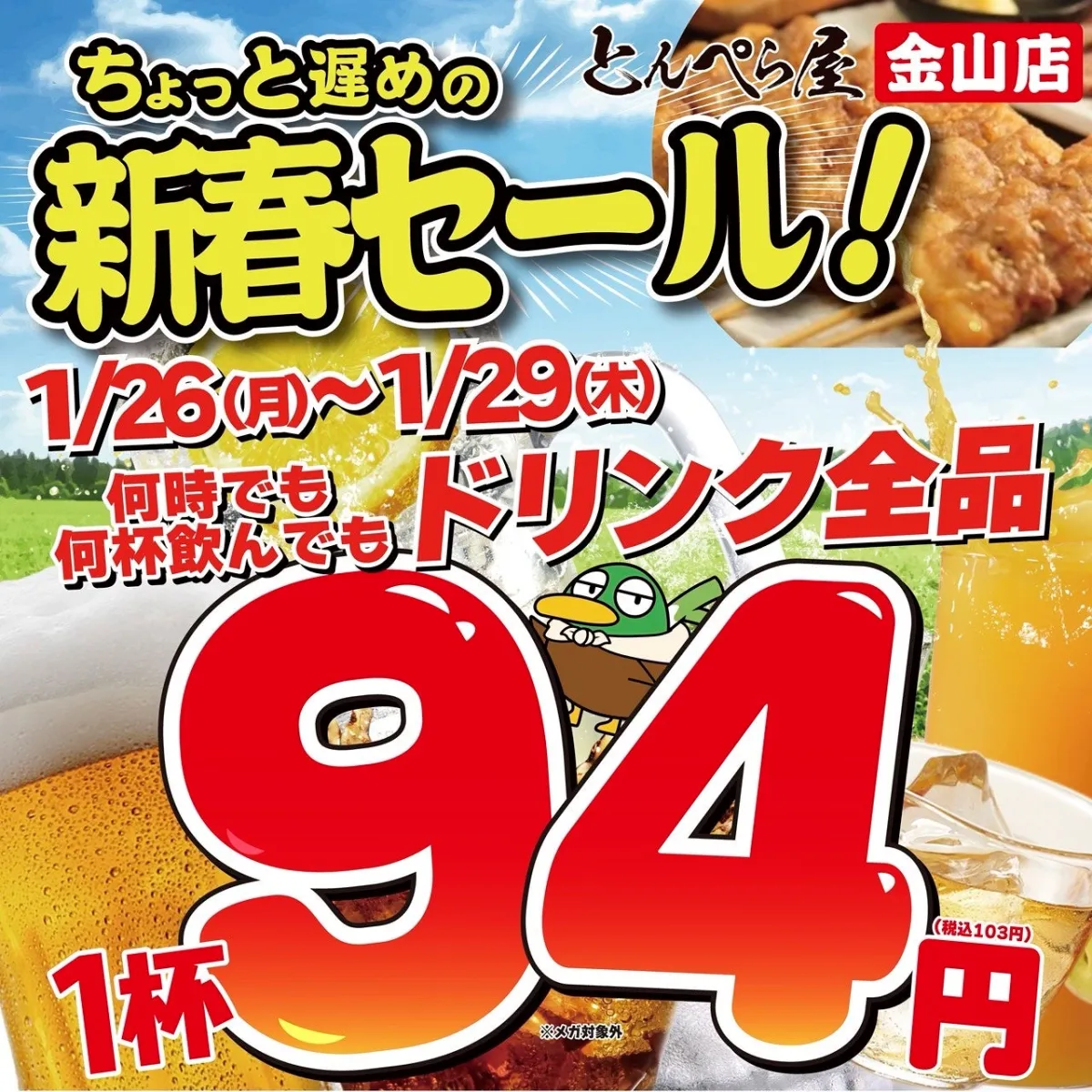 皆さん、名古屋の人気鴨料理店、「とんぺら屋 金山店」が新春を祝う特別セールを実施します!このセールは、2026年1月26日(月)から29日(木)の4日間にわたって行われ、なんとドリンクすべてが94円という驚きの価格で楽しめます!