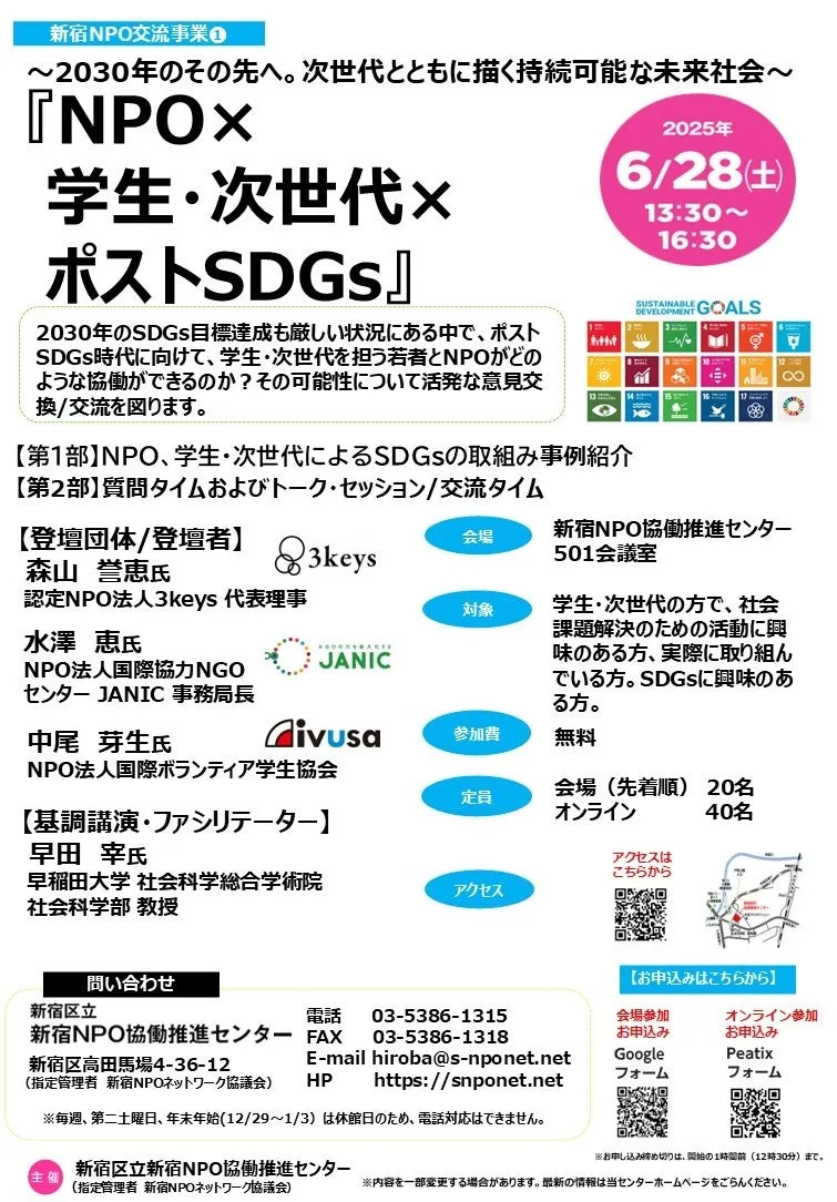 2023年6月28日(土)、新宿にて交流イベント「NPO×学生・次世代×ポストSDGs」が開催されます。このイベントは、次世代を担う学生たちとNPOの協力関係の構築を目指し、持続可能な未来を共に描くことを目的としているのです。今日の学生や若者たちは、社会課題に対して非常に高い関心を持っています。それにもかかわらず、様々な問題を解決する道のりは決して容易ではありません。近年、2030年を見据えたSDGs(持続可能な開発目標)への取り組みが進められていますが、その達成が目前に迫っている現状は厳しいと言えます。このため、ポストSDGsの時代が視野に入る中で、学生たちがNPOと共にどのような新しい可能性を創出できるのか、意見交換や交流を通じて深堀りしていきます。