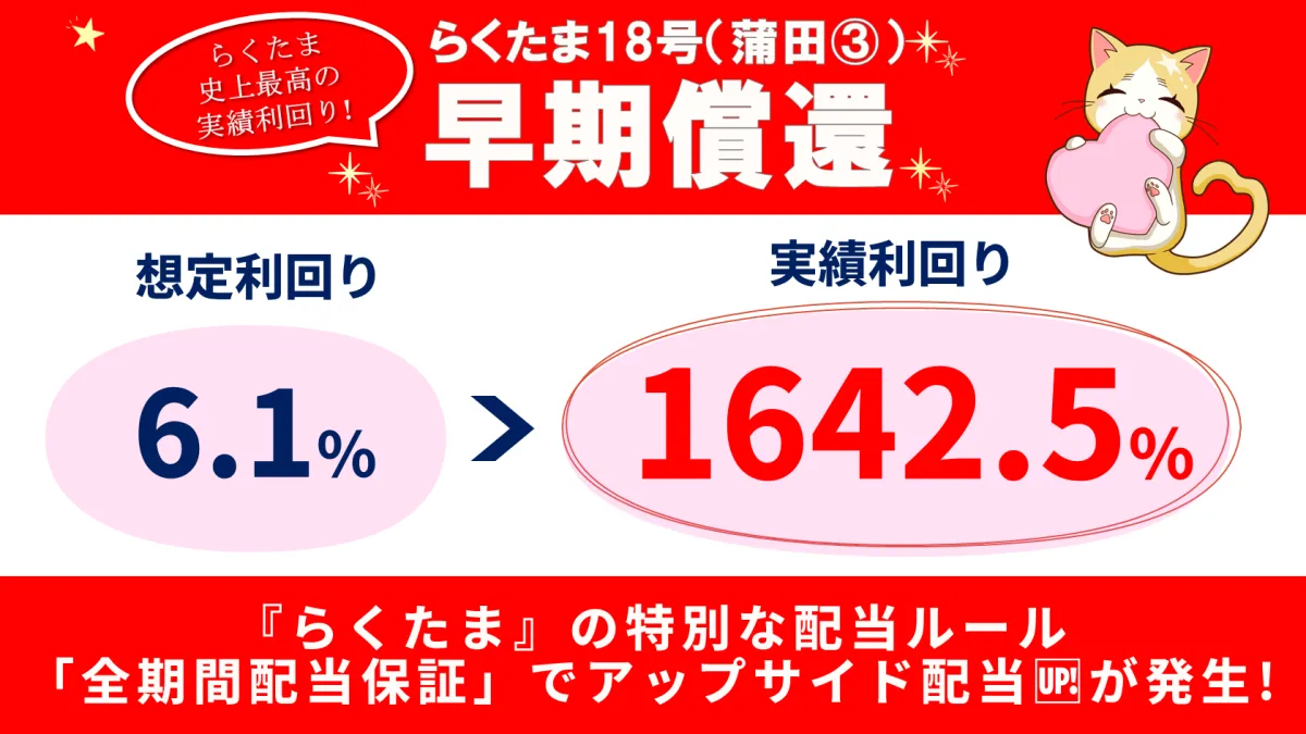 ファンドには全期間配当保証という特別なルールが適用され、「全期間分の配当金が保証される」という非常に魅力的な仕組みがある。通常のファンドでは、早期償還がなされると無駄に感じる運用期間の配当金を受け取ることができないが、『らくたま』はそのリスクを軽減し、投資家に対して公平に利益を分配する。特に、18号は募集が終わった直後に運用が終了という異例のデザインがされており、その結果、長期にわたる投資機会を狙ったファンドが実現した。
