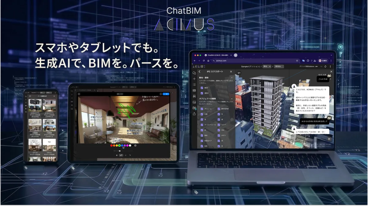 株式会社ACIMUSは、東京・千代田区に本社を置くスタートアップ企業で、生成AI技術を駆使した建設DXの推進に取り組んでいます。特に、ChatBIM「ACIMUS」は、ユーザーが生成AIと対話しながらBIMモデルを直感的に作成・編集できるクラウドサービスです。特別なソフトウェアのインストールは不要で、PCだけでなくスマートフォンやタブレットでも活用できます。
